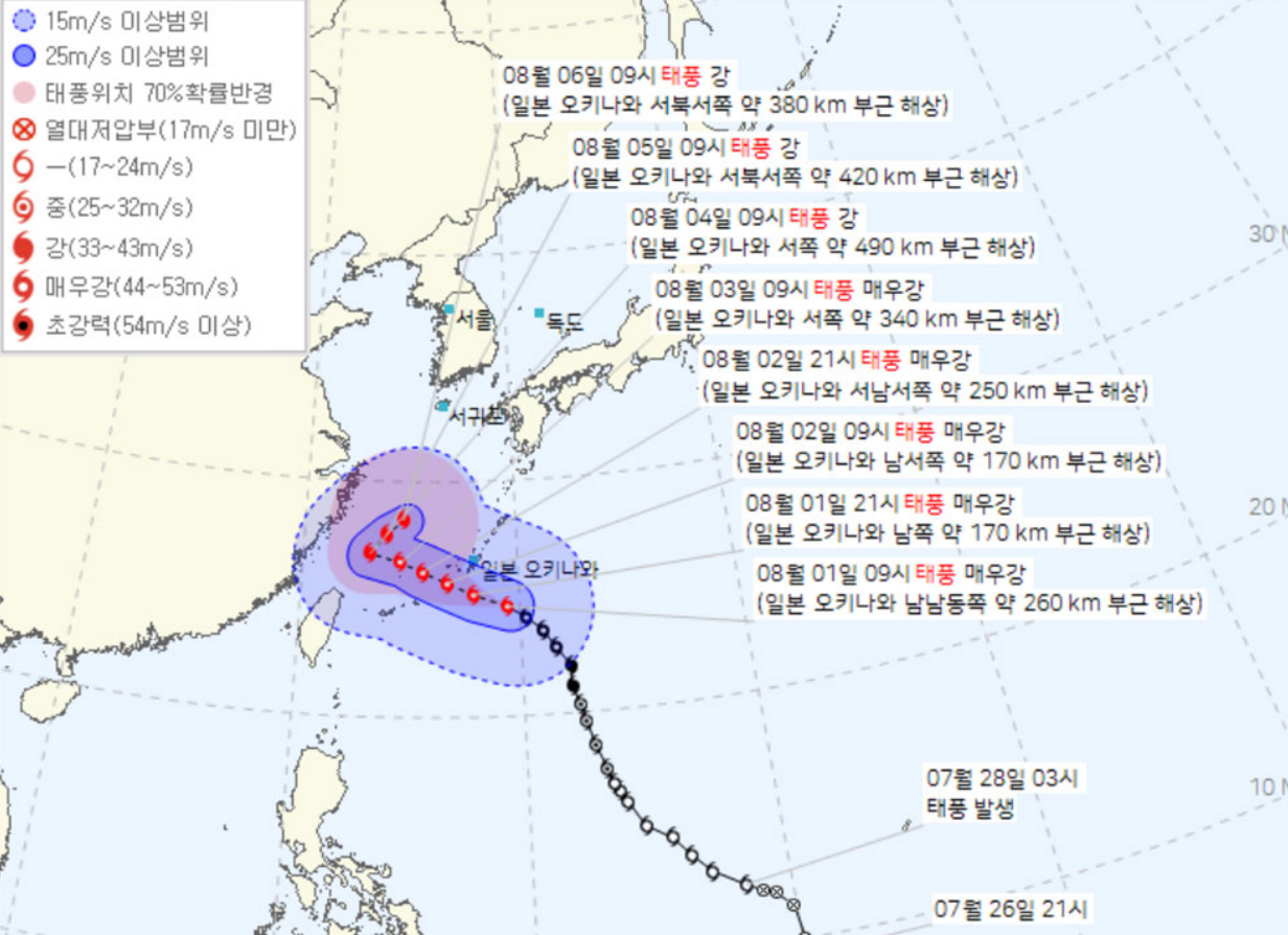 다만 이후 정체하며 동쪽으로 발향을 틀어 주말경우 느리게 북동 진할 것으로 예측됩니다. 이후 전망은 무척 유동적이지만 한반도로 북상할 가능성이 있다고 기상청은 내다보았습니다.